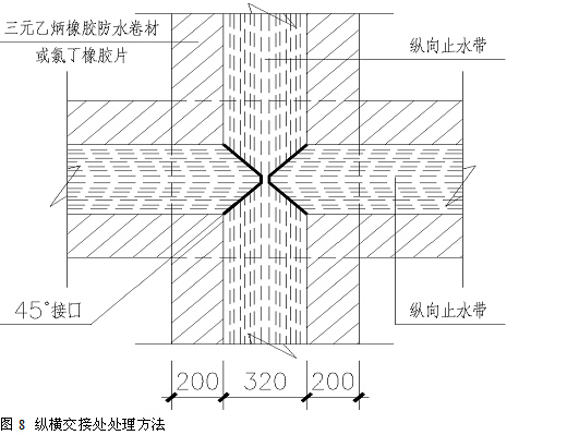 橡膠止水帶縱橫交接處,在混凝土墊層上沿縱橫止水帶外側向外擴展各200mm,其間粘貼3mm厚的三元乙丙橡膠防水卷材或氯丁橡膠片(粘貼于墊層之上,要牢固)。然后將橫向止水帶兩邊沿45°角斷開,并與縱向止水帶拼接嚴密。再用401 防水膠將止水帶與防水卷材或橡膠片粘貼牢固,并在接口處刷氯丁膠粘劑,將接口包實。如圖8 所示。