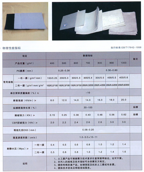 復合土工膜是由土工布為基材、高分子材料等(如PE膜、EVA等)為膜材兩種以上的材料復合而成的土工合成材料。它以土工織物為導水層,以高分子材料為防滲層,經壓延、熱溶涂敷而成,該生產工藝既保持了土工基布的良好力學性能,又使復合產品薄膜厚度均勻,剝離強度高,避免了薄膜上氣孔、砂眼的形成,大大的提高了膜的抗滲強度,薄膜表面采用壓花處理,增加了成膜的摩擦系數,既提高了防滲工程的穩定性,又方便了施工。該產品幅寬3-6.0米。